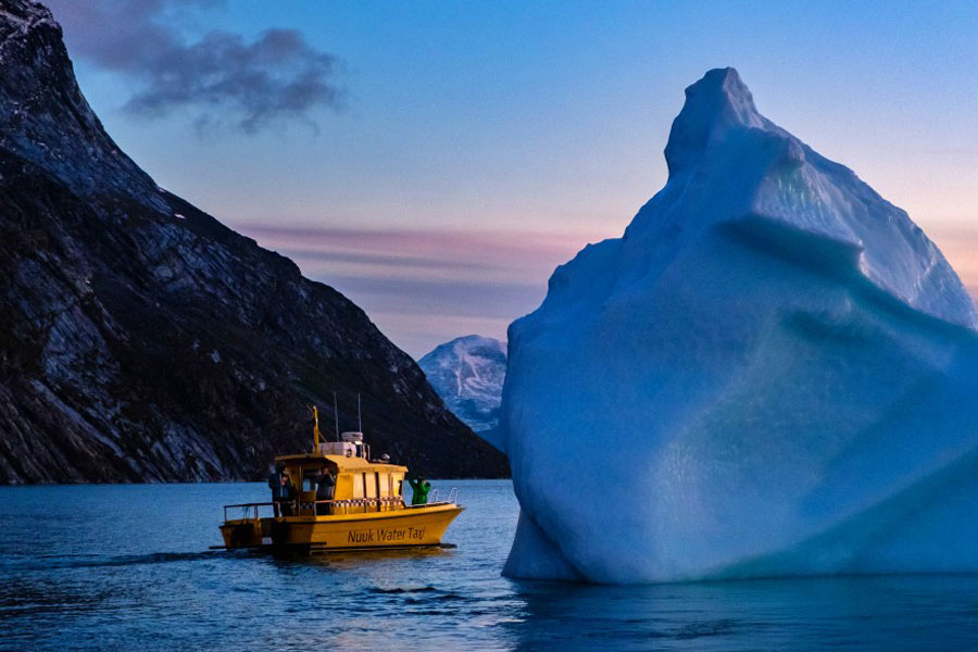 Vi skal opleve et af verdens største naturvidundere, når vi sejler mellem de enorme isbjerge i den mægtige bugt, der ligger mellem Grønlands vestkyst og Disko-øen. Sejlturen varer ca. 2,5 time og da Ilulissat ligger tæt på den imponerende Sermeq Kujalleq-gletsjer, er det garanteret, at vi får set masser af de isbjerge, der hver sommer bevæger sig gennem bugten på deres vej mod Atlanterhavet.